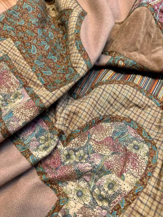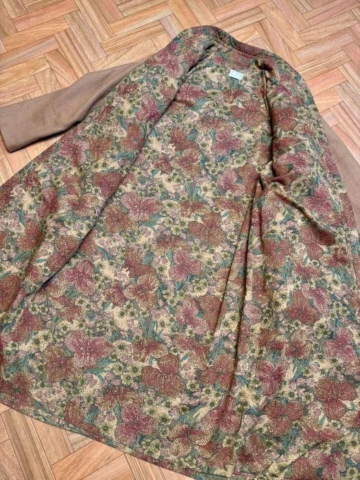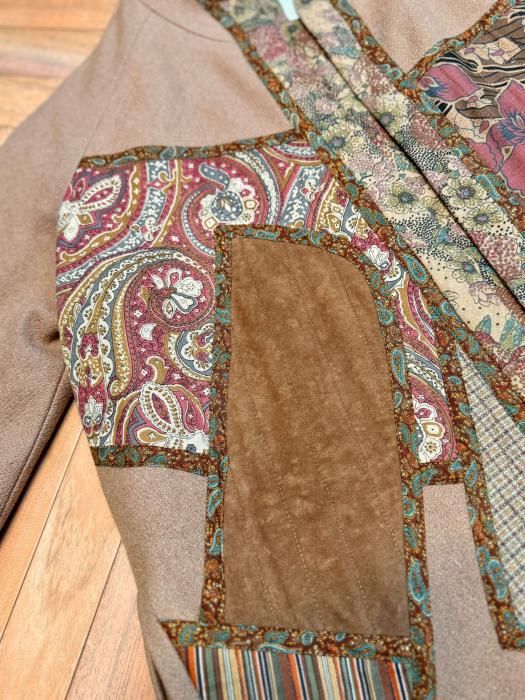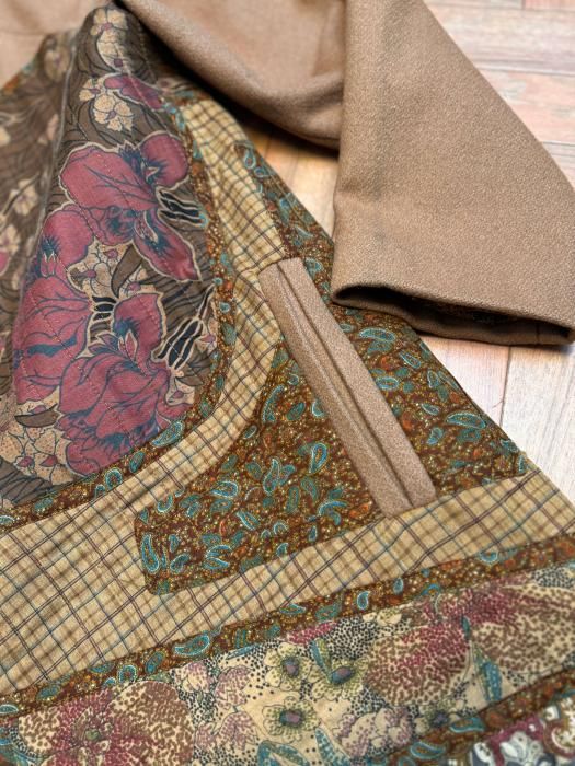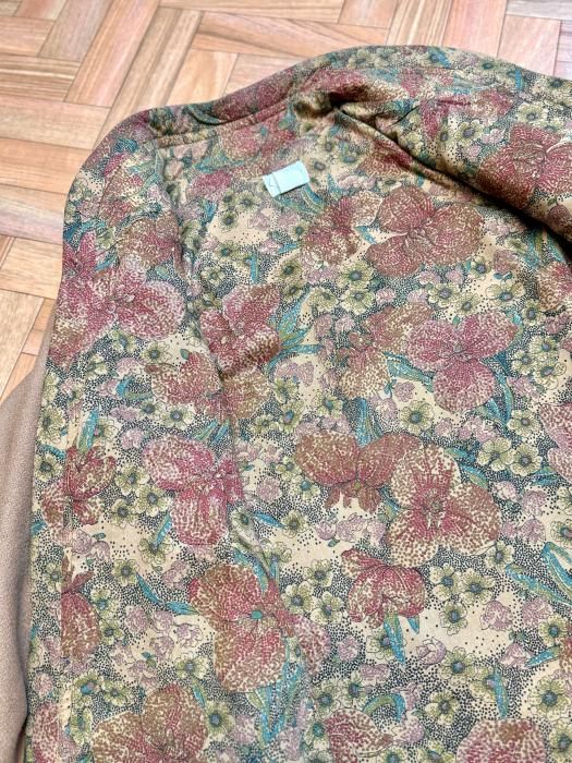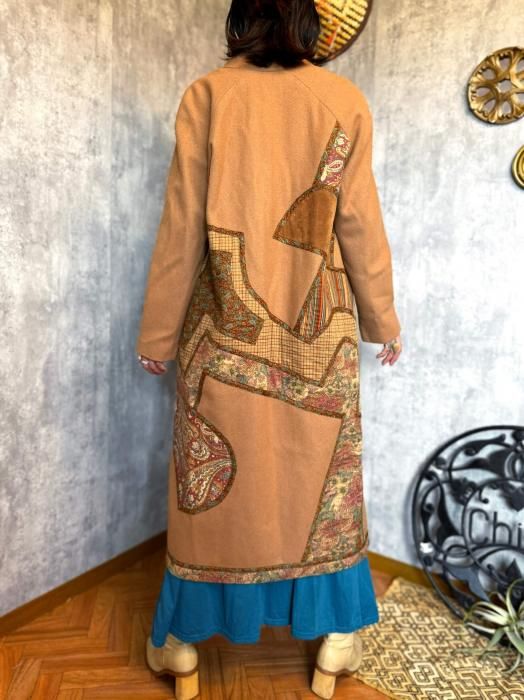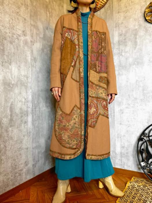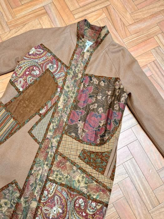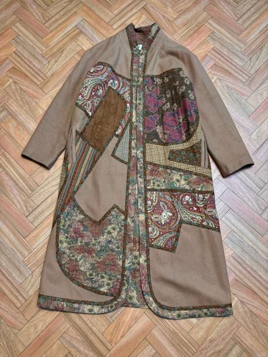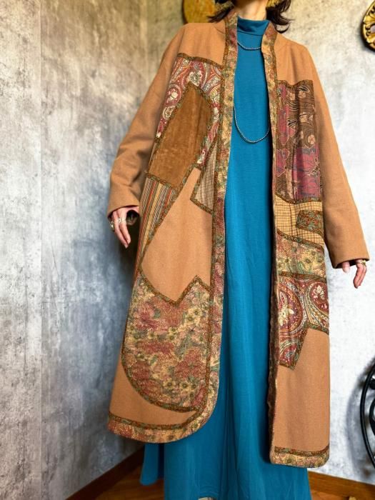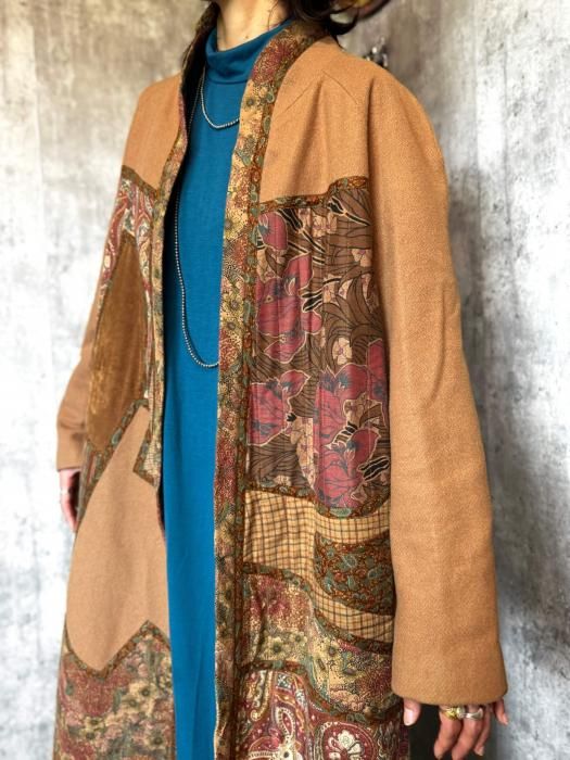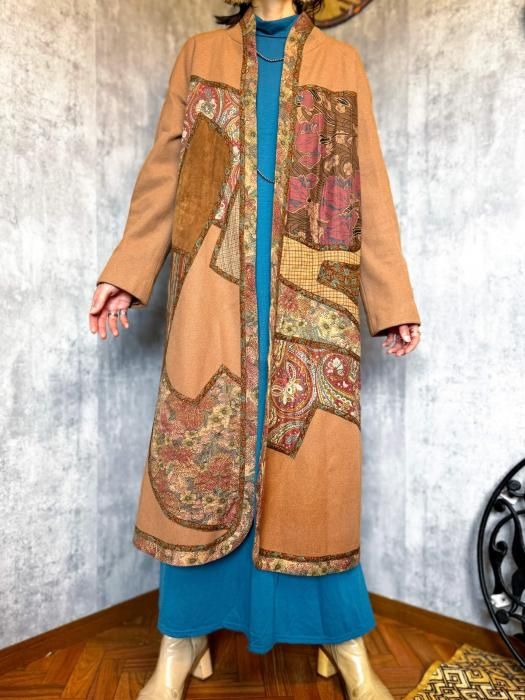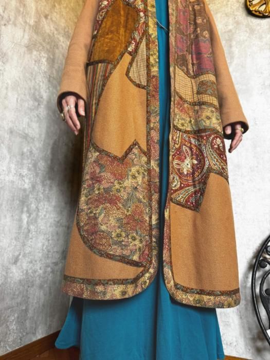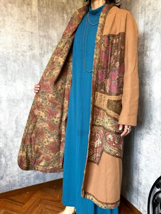 ぬくもりのあるキャメルベージュをベースに花柄、チェック、キルティングベロアなど様々な生地をミックスして仕立てられた大変デザイン性の高いヴィンテージピースです。肩の切り替えのないラグランスリーブ、体をすっぽりと包み込むようなガウンシルエットで着ても見た目にも暖かく、本格的な冬のアウターとしてご着用いただけます。