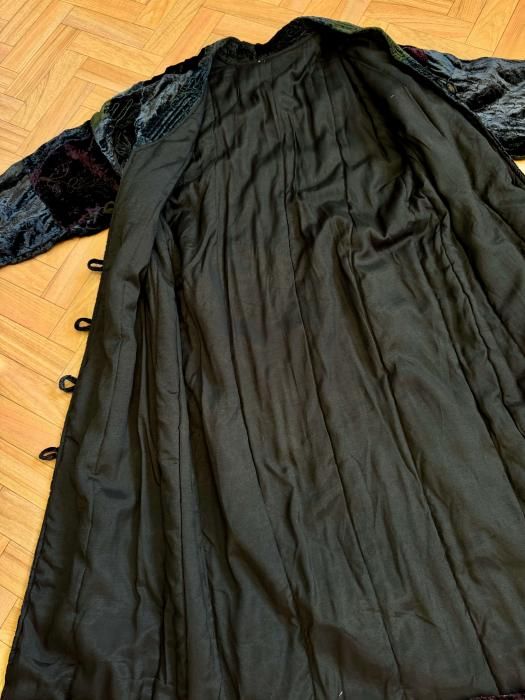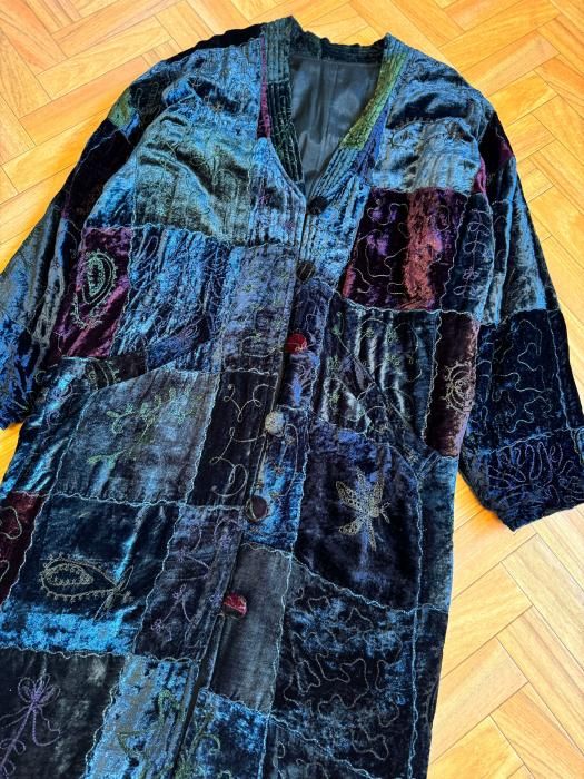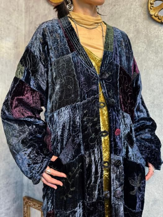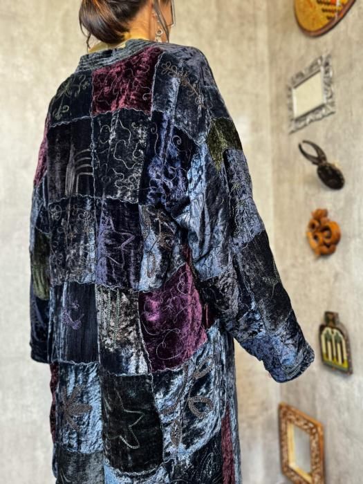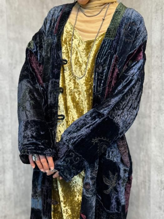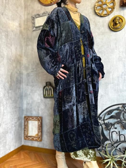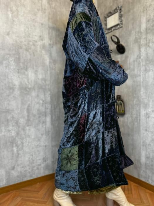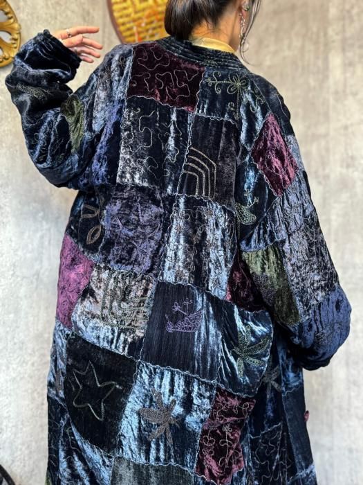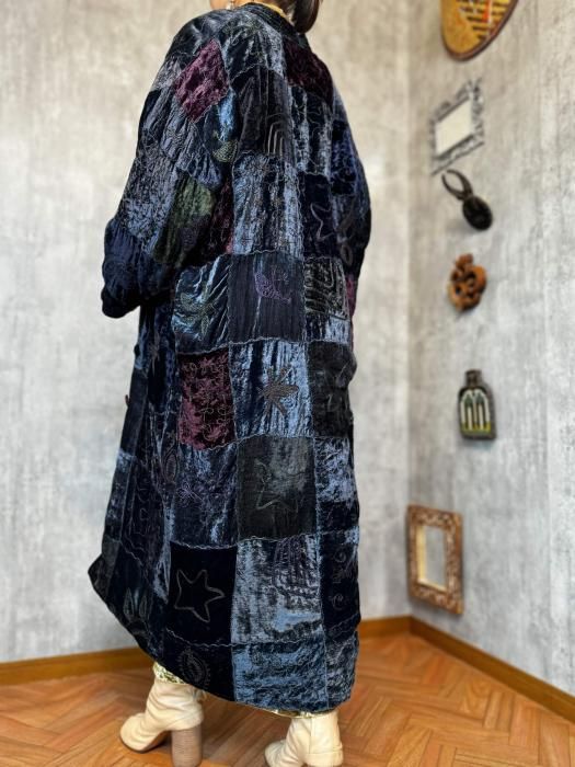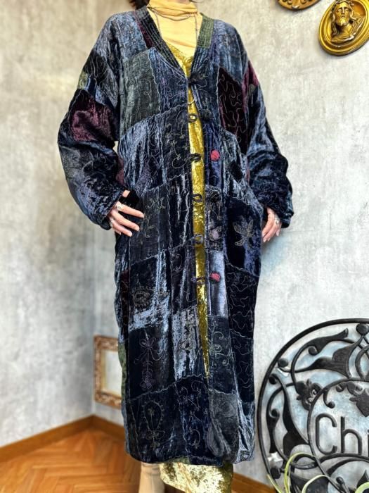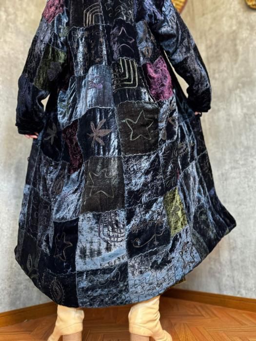 ネイビーブルーをベースカラーに刺繍の入ったテキスタイルをパッチワークして仕立てられたデザイン性の高い1着です。ベロアならではのツヤと立体感が唯一無二の存在感を放ちます。体をすっぽりと包み込むようなオーバーシルエットとフルレングスの着丈で雰囲気満点。肉厚の生地を使っており暖かさも抜群です。両サイドポケット付き。