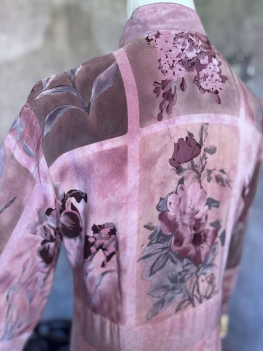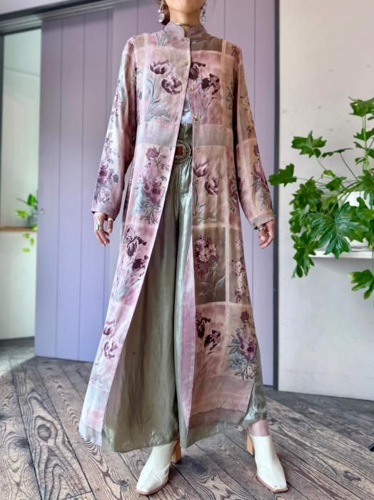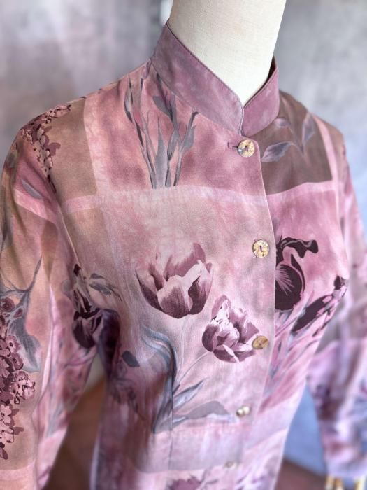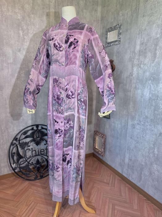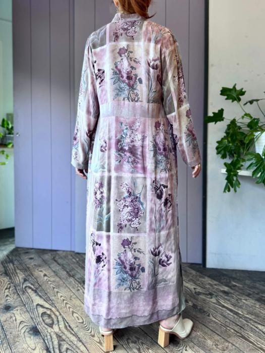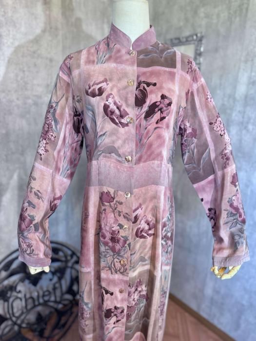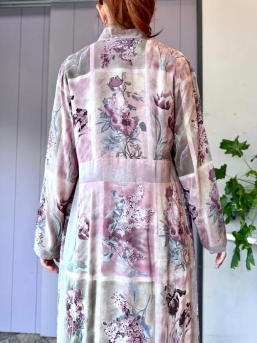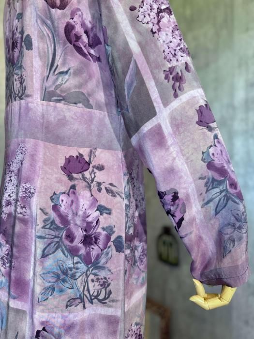 美術作品のように繊細に描き込まれたオリジナルのテキスタイルが大変美しい貴重な1着です。シルクならではの美しい発色と豊かな柄の表現力が印象的。贅沢にたっぷりとシルク生地を使用して仕立てられており、そのテキスタイルの美しさを存分に楽しむことが出来ます。落ち着いたトーンのパープルカラーでまとめられたカラーリングも新鮮です。