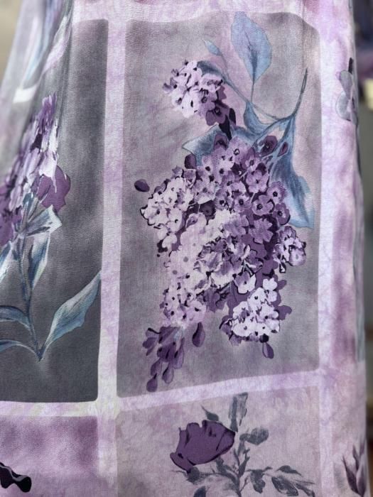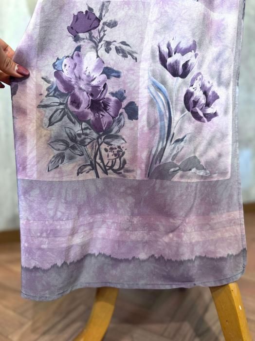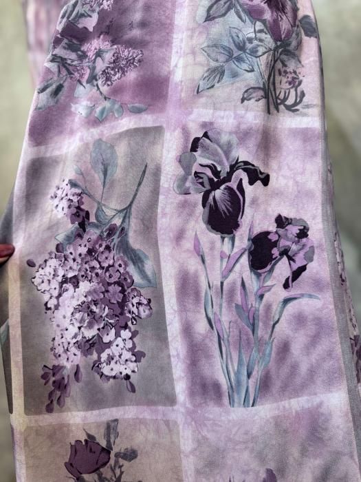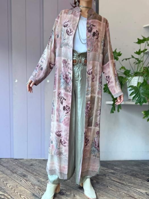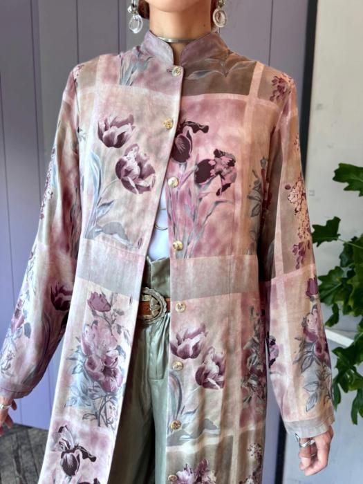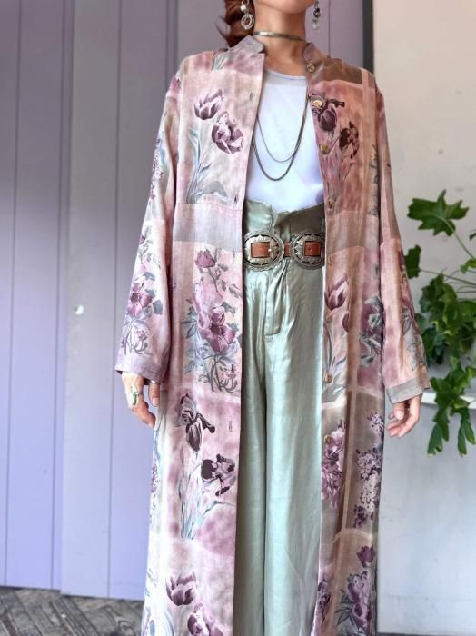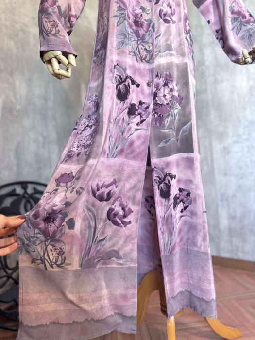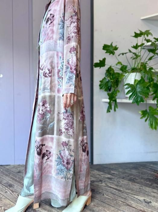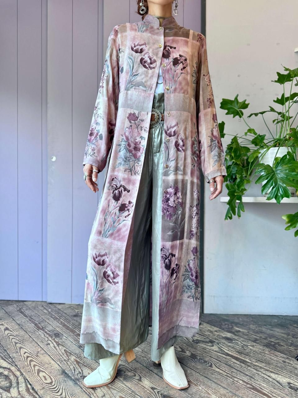 美術作品のように繊細に描き込まれたオリジナルのテキスタイルが大変美しい貴重な1着です。シルクならではの美しい発色と豊かな柄の表現力が印象的。贅沢にたっぷりとシルク生地を使用して仕立てられており、そのテキスタイルの美しさを存分に楽しむことが出来ます。落ち着いたトーンのパープルカラーでまとめられたカラーリングも新鮮です。