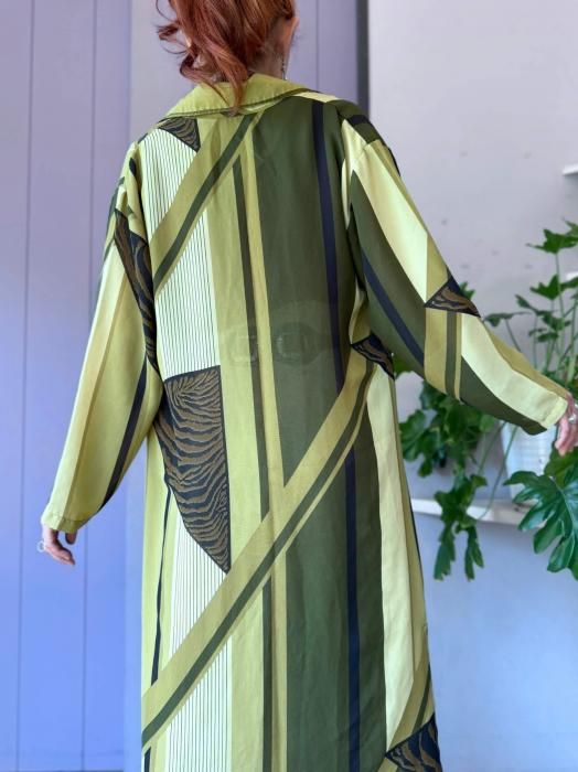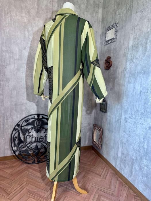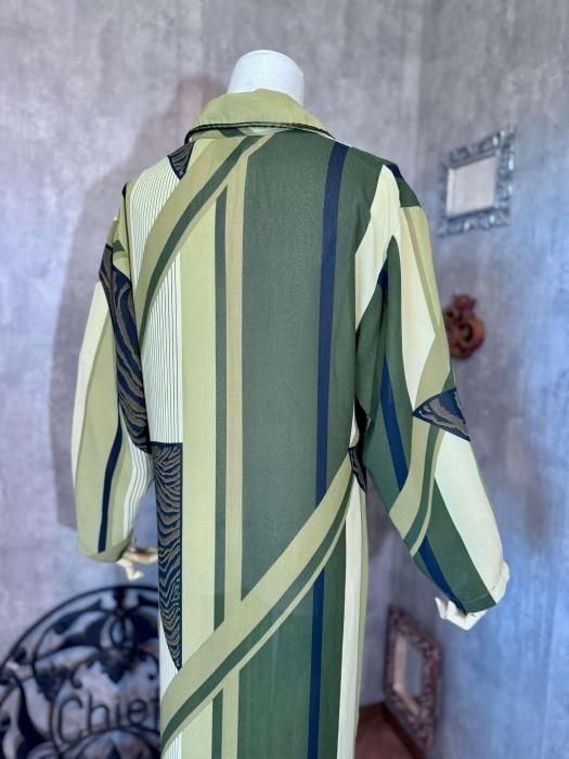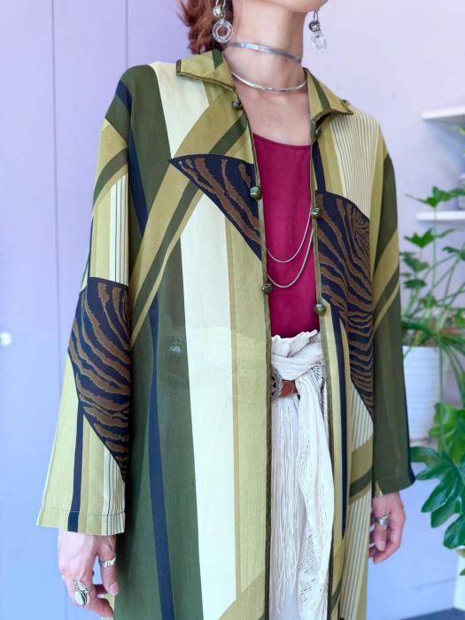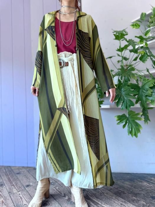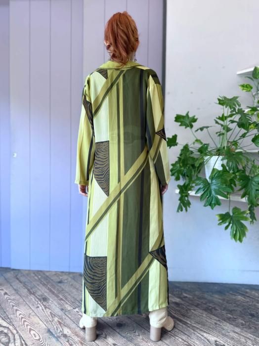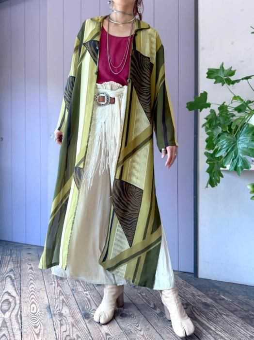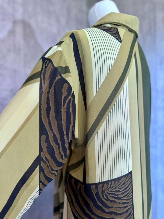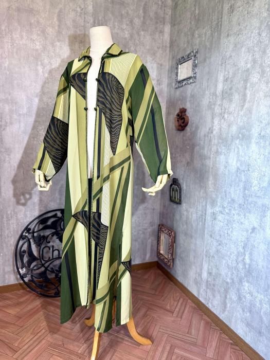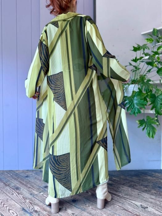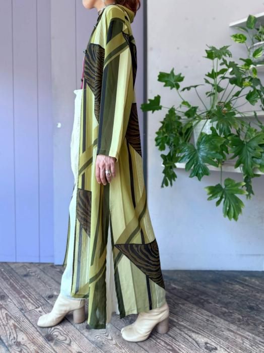 秋の着こなしにふさわしいシックなカラートーンと品のあるアートパターンがよくマッチしたバランスの取れたデザインが秀逸。風通しの良い薄手の生地ですので、季節の変わり目のレイヤードスタイルに活躍する生地感です。フルレングスの着丈がこなれた雰囲気を演出してくれ、唯一無二の存在感を放ちます。