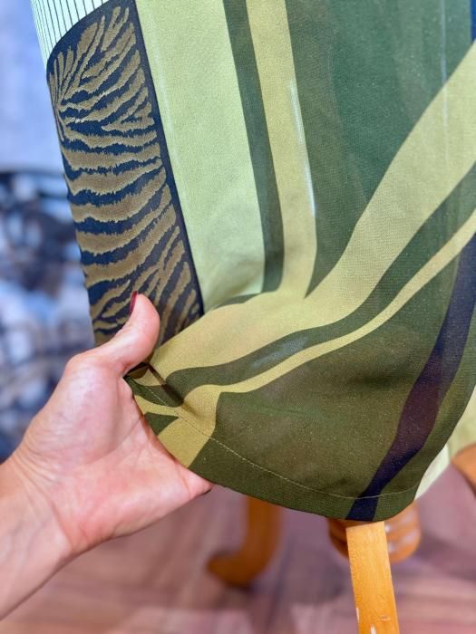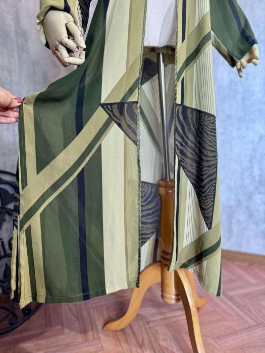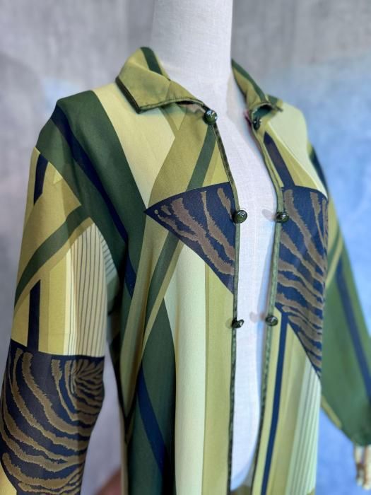 あまり目にしたことのない幾何学模様とカーキベースのカラーリングのが新鮮なですね!程よく落ち着いたカラートーンと抜け感のあるテキスタイルデザインでデイリーにも取り入れやすく、様々なシーンでさっと袖を通せる羽織ものとしてお使いいただけるかと思います。画像のように明るいカラーをプラスすると華やかな印象に、黒・茶などダークトーンの色を合わせてシックにスタイリングするのも素敵です。まだ暑さの残る頃にはインナーにTシャツやロンTを、季節が進んだ頃には薄手のハイネックニットをレイヤードしていただくと長いシーズン楽しみいただけますよ。