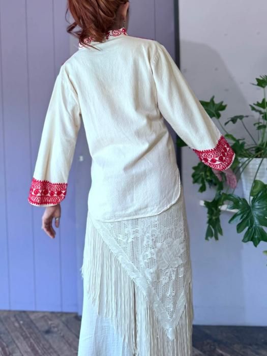 味のあるアイボリーカラーに真っ赤な単色刺繍が生えるアイキャッチーなデザインが印象的。コンパクトなシルエットでワイドパンツやマキシスカートとのスタイリングもバランスよくまとまるお品です。