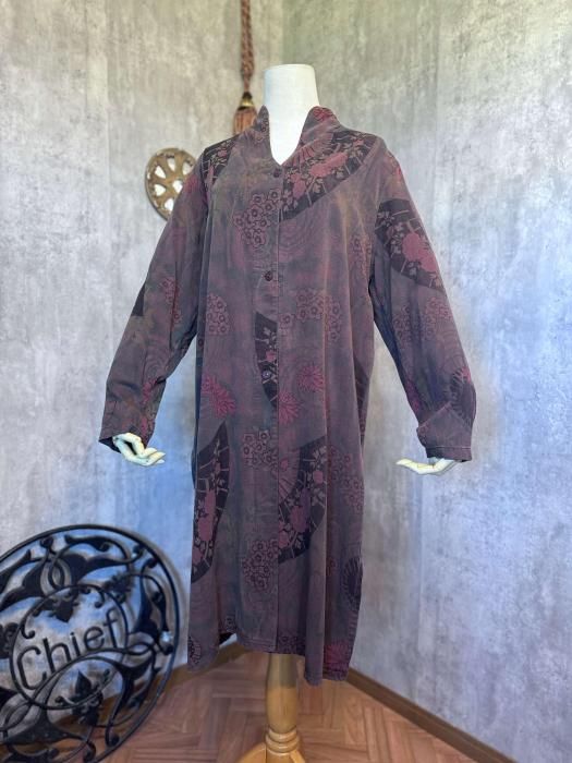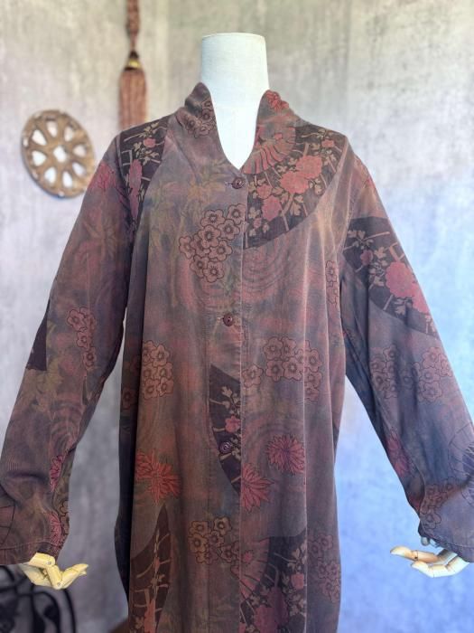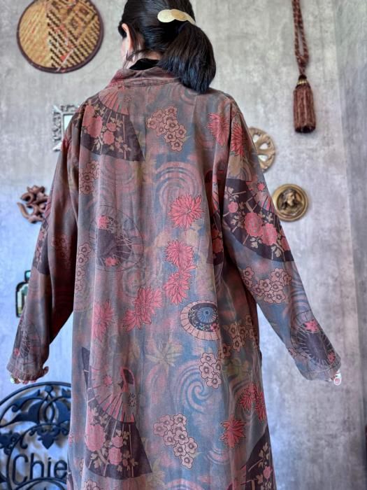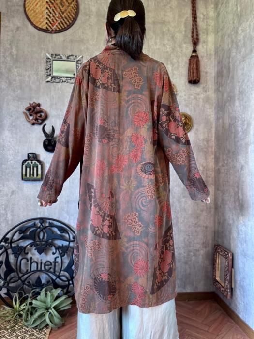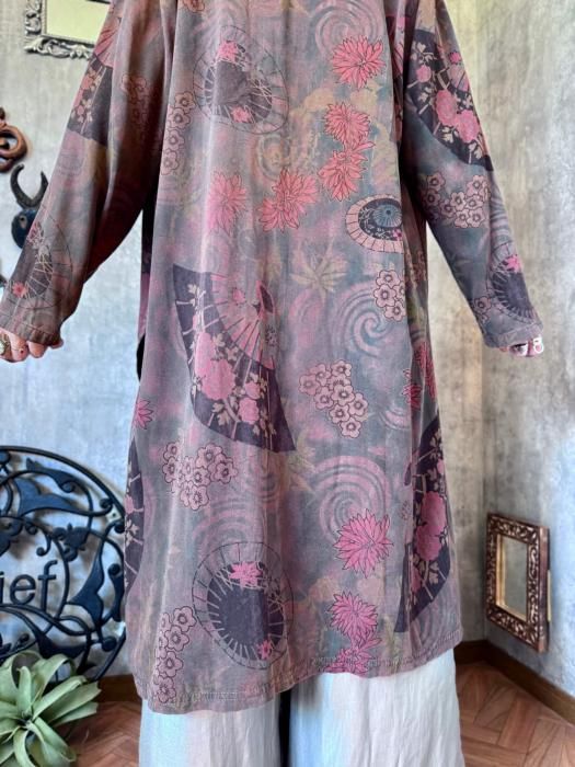 秋の着こなしにマッチするダークトーンのカラーリングとユニークな扇子パターンが目を惹く1点物ならではのテキスタイルです。風合いのあるユーズド調の加工が施された素材感がコーディネートに深みを与えてくれます。