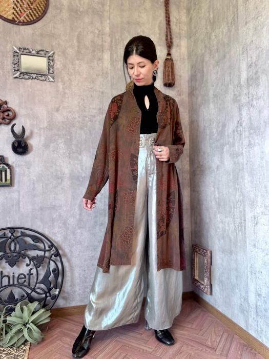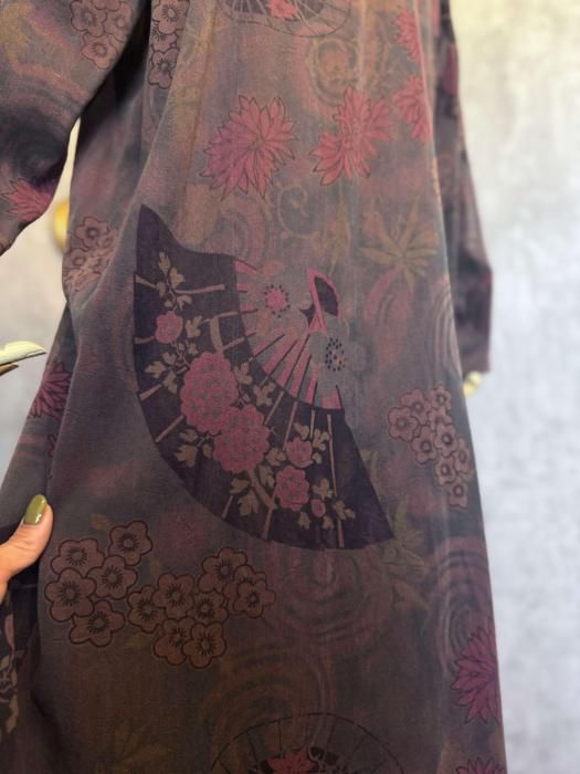 大人びた印象で楽しめそうなカラートーン、全体にちりばめられた扇子、マニッシュなシルエットetc...渋さとユーモアのバランスが秀逸なデザイナーズアイテムです!似たようなアイテムはなかなかお目にかかれないと思いますので、ぐっときた方にぜひお選びいただきたい1着です。黒やボルドーなど秋らしいお色をプラスすると、ぐっと季節感のあるコーデに仕上がりますよ。サイズが合えば、男性にもお勧めしたいアイテムです。