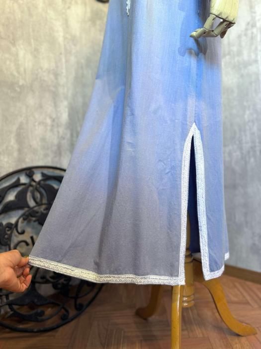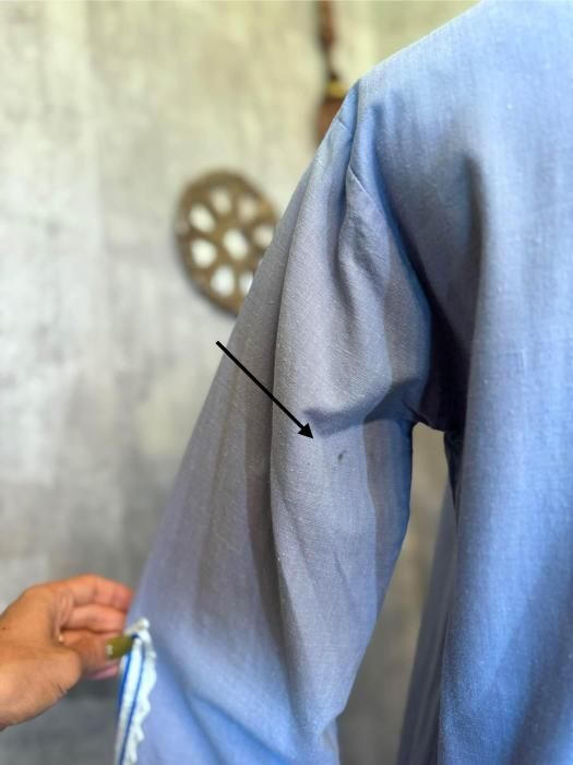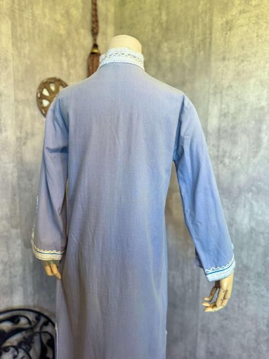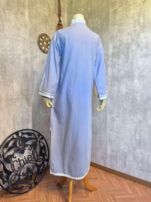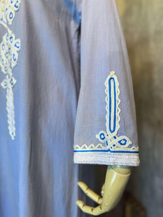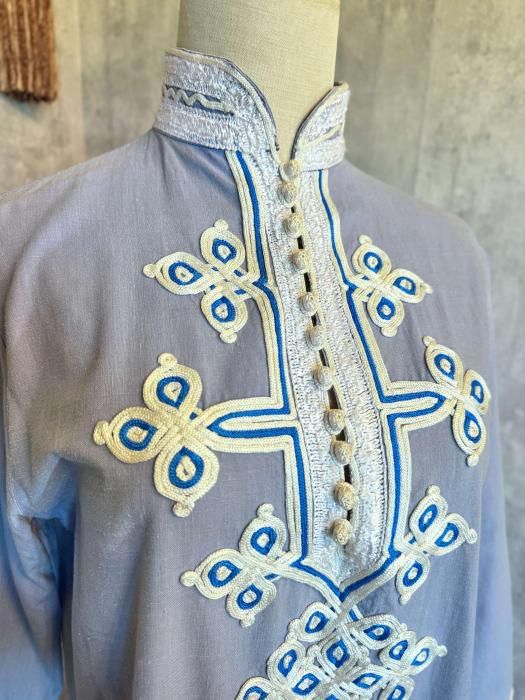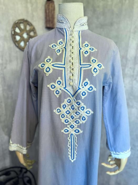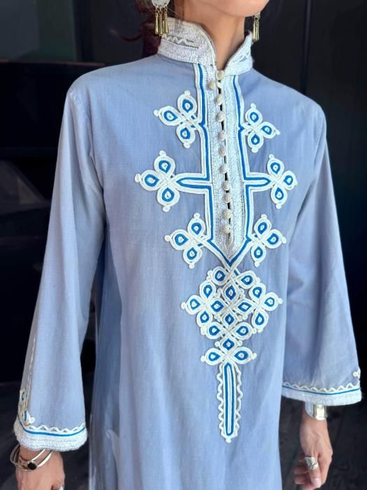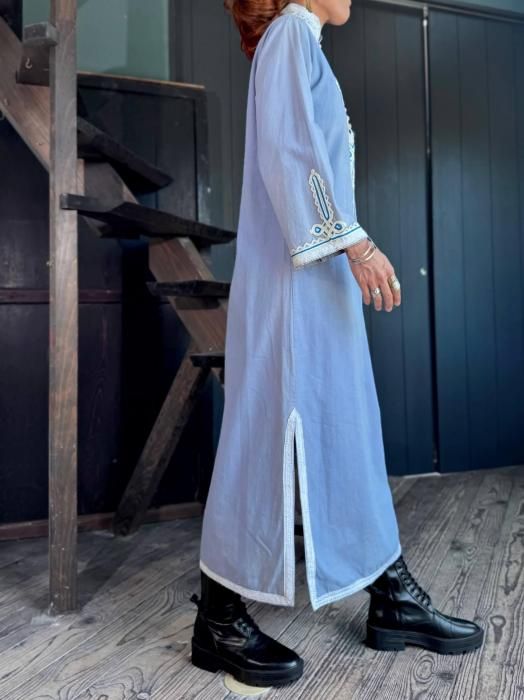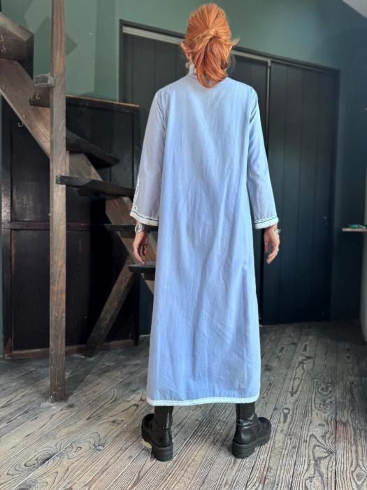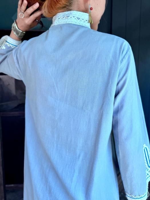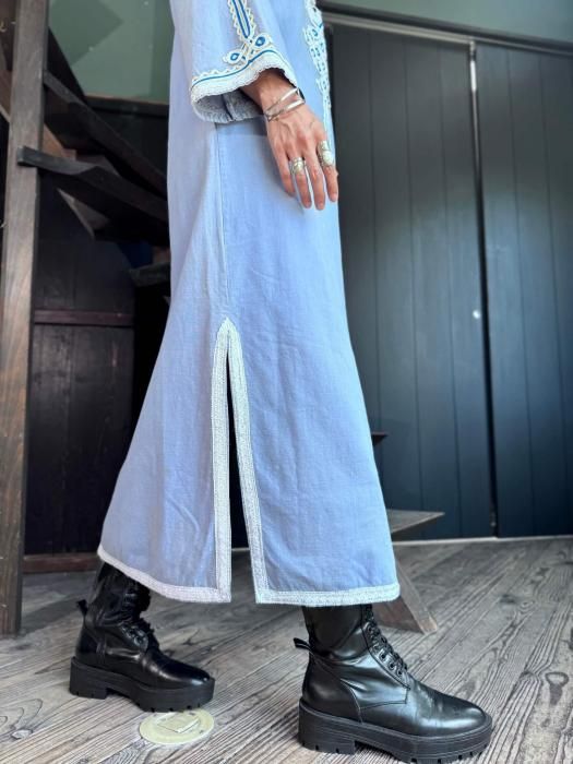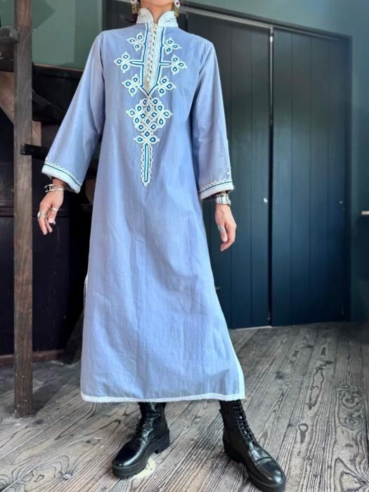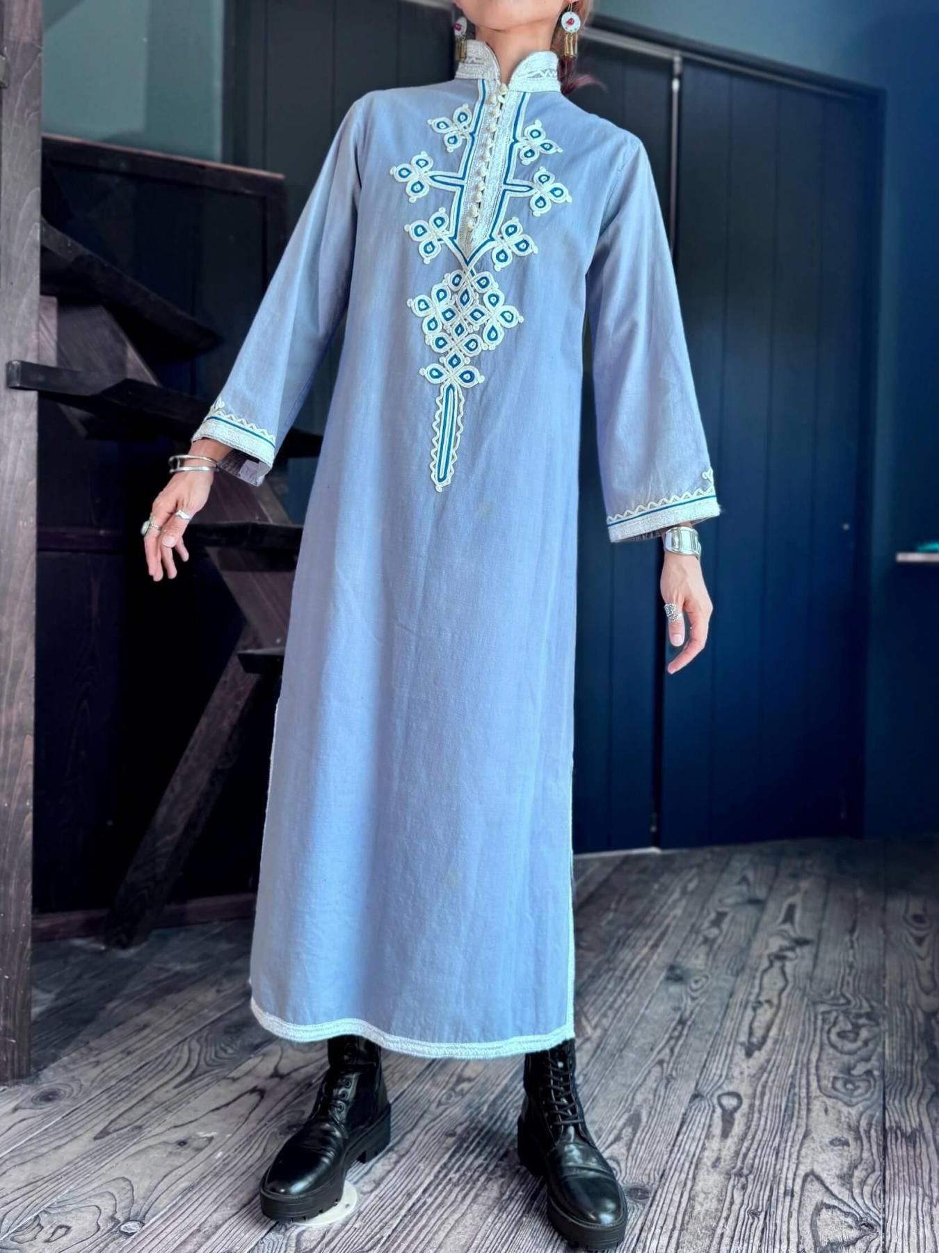 グッドバランスな配置とどこかエッジィな刺繍デザインが秀逸なモロッコ刺繍ドレスです。新品のものでは味わえない風合いのあるブルーに心ときめきますね!ストンとしたストレートシルエットですので、デイリーにも着やすく着心地も良いかと思います。秋冬にジャケットやコートを羽織っても、フロントの刺繍部分を見せて着ることができるのでこれからのシーズンにもおすすめ。インナーにハイネックニットをレイヤードしても素敵ですよ。