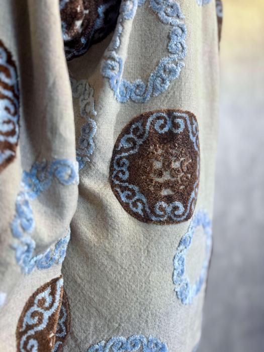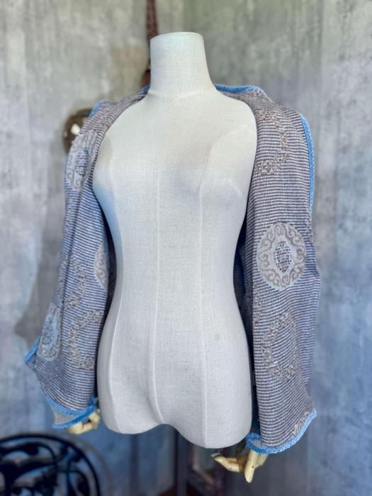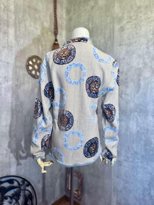 肌なじみの良い明るいベージュをベースにライトブルーのパイピング、上品なアジア柄が描かれたグッドバランスな1着です。フロントボタンは1つのみ、アクセサリーのようなブルーボタンがアクセントに。裏地がなく薄手の軽い着心地ですので、季節の変わり目のレイヤードスタイルに活躍します。