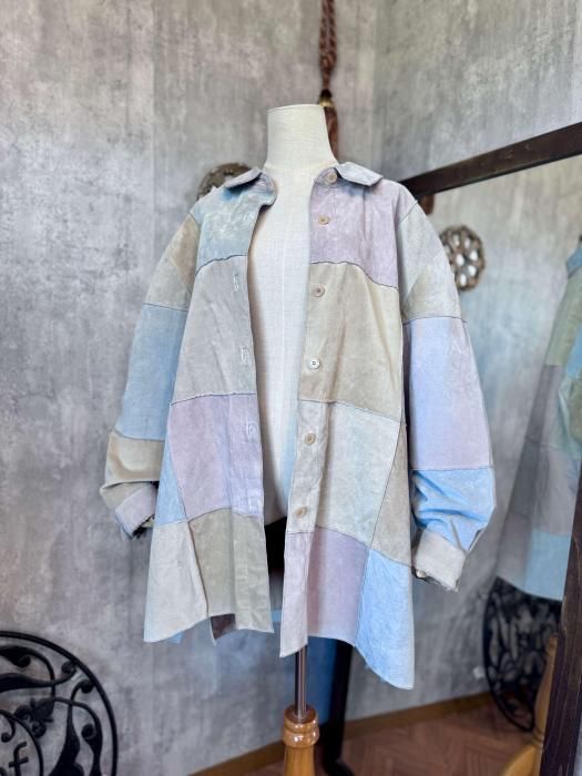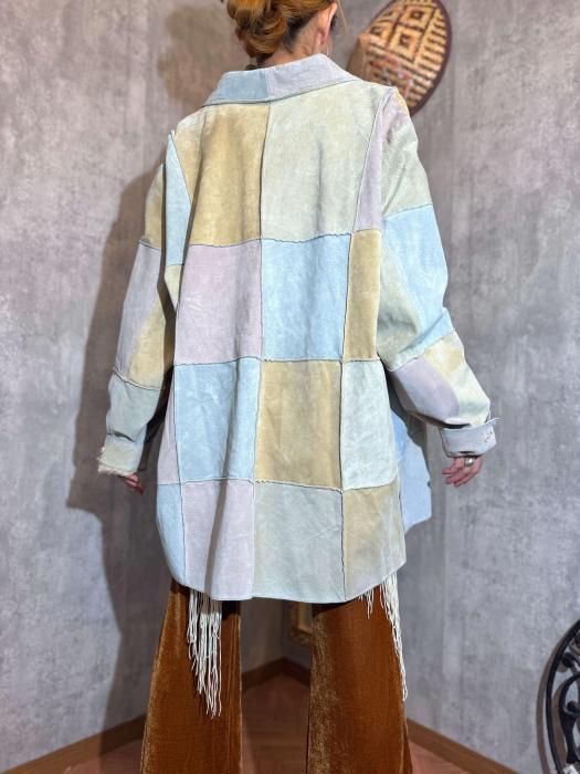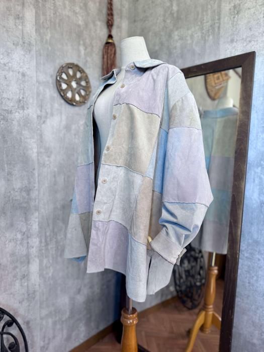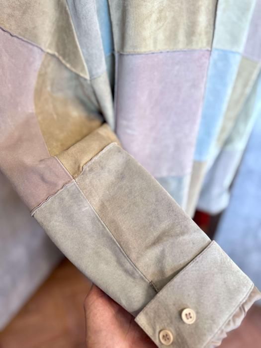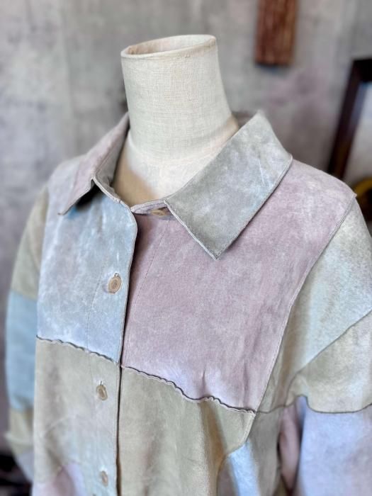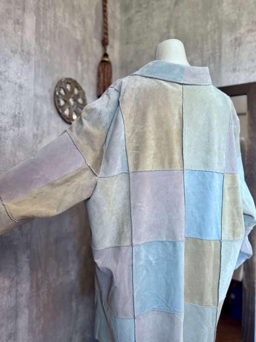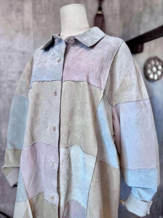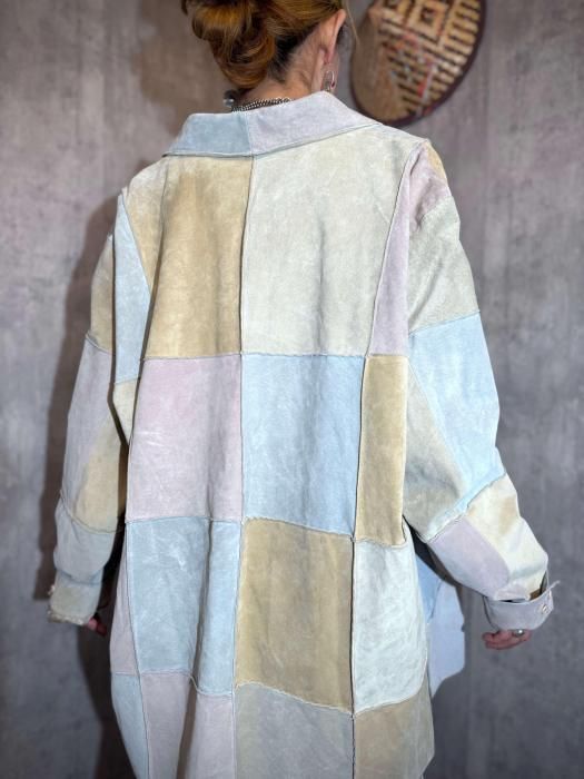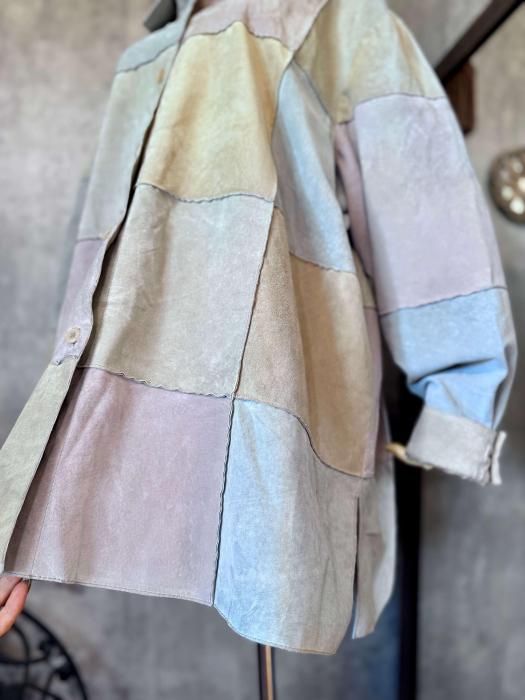 パステルトーンのカラースウェードがランダムにパッチワークされたユニークな1着です。ゆったりとしたオーバーサイズシルエットで、アウター感覚でお楽しみいただけます。