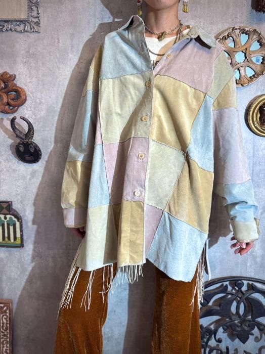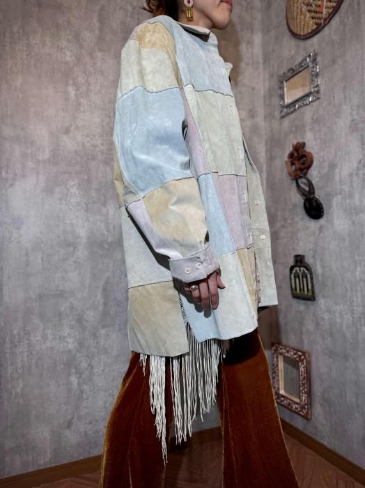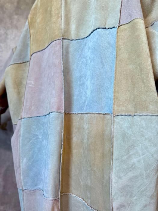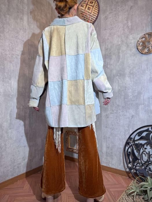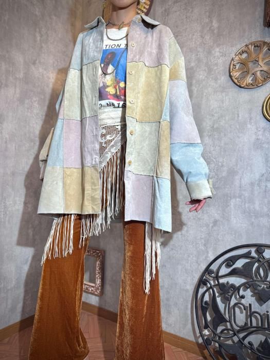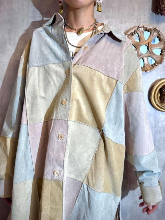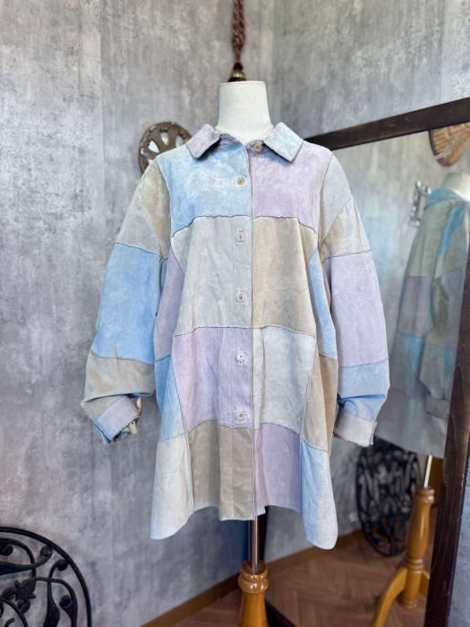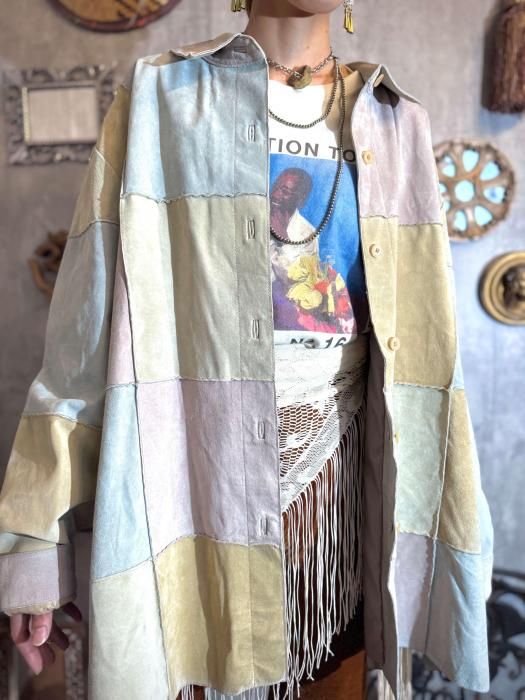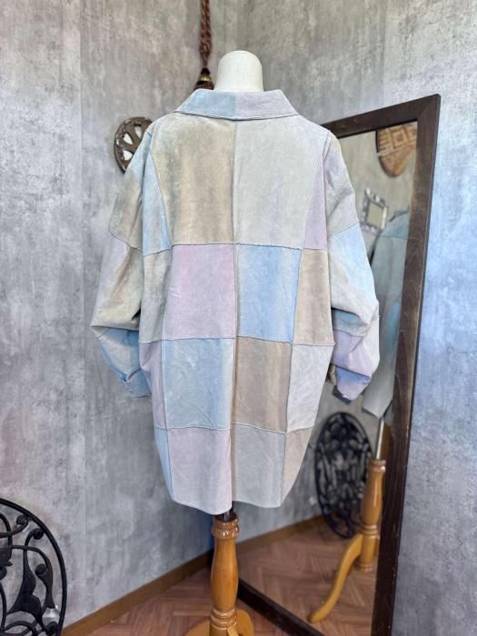 パステルトーンのカラースウェードがランダムにパッチワークされたユニークな1着です。ゆったりとしたオーバーサイズシルエットで、アウター感覚でお楽しみいただけます。