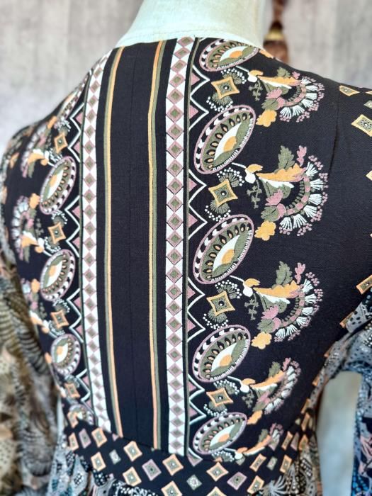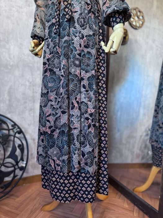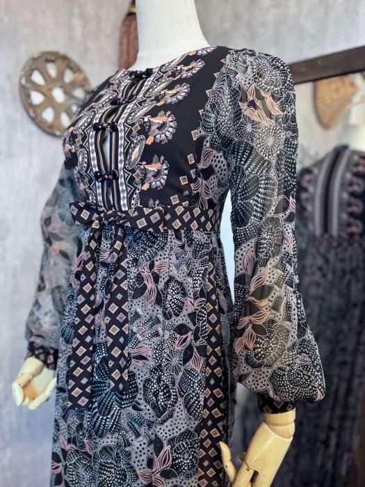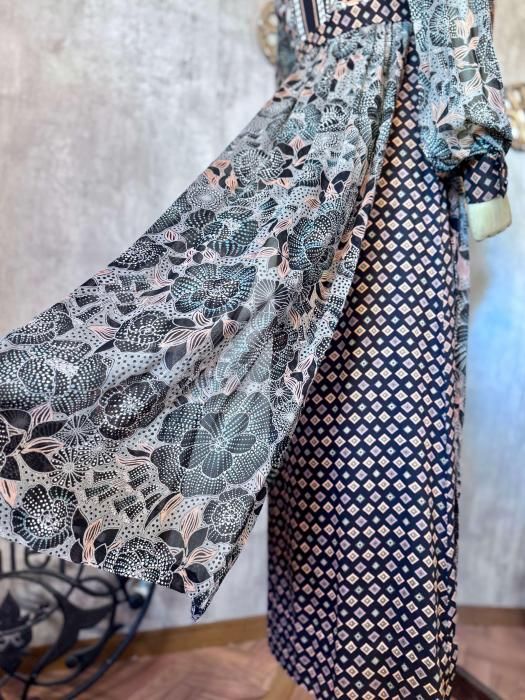 女性が美しく見えるよう計算し尽くされたフォルムや、テキスタイルのセレクト、生地使いのバランスなど、遠い過去に生きたデザイナーさんのセンスを感じることが出来る逸品です。全体に散りばめられた70年代らしいディテールにもときめいてしまいますね!アンダーバストがややタイトめ、着丈も長めですのでサイジングをご確認の上ご検討いただけましたらと思います。ひと目で美しい佇まいなので、衣装や特別な日の1着にもおすすめですよ。