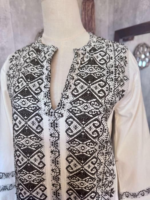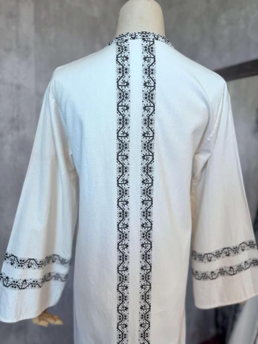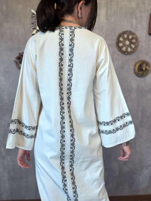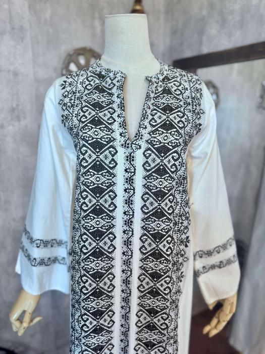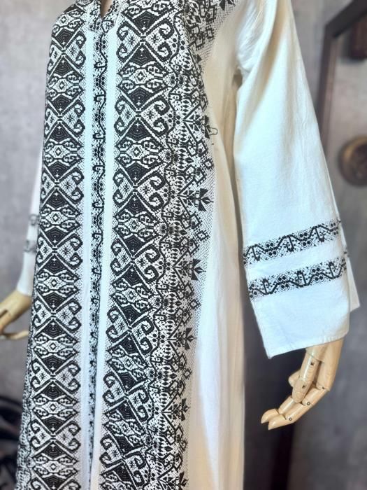 風合いのあるヴィンテージコットン生地にたっぷりと刺繍が施されたコントラストのある佇まいが印象的です。絞りのないすとんとしたストレートシルエットで、大人びた印象でお楽しみいただけます。