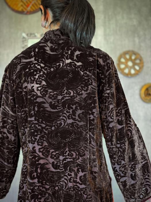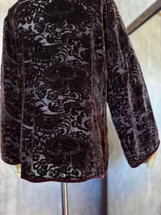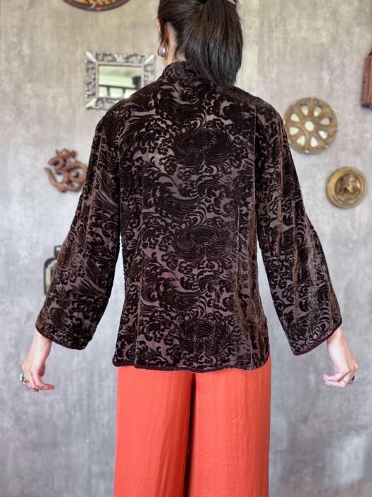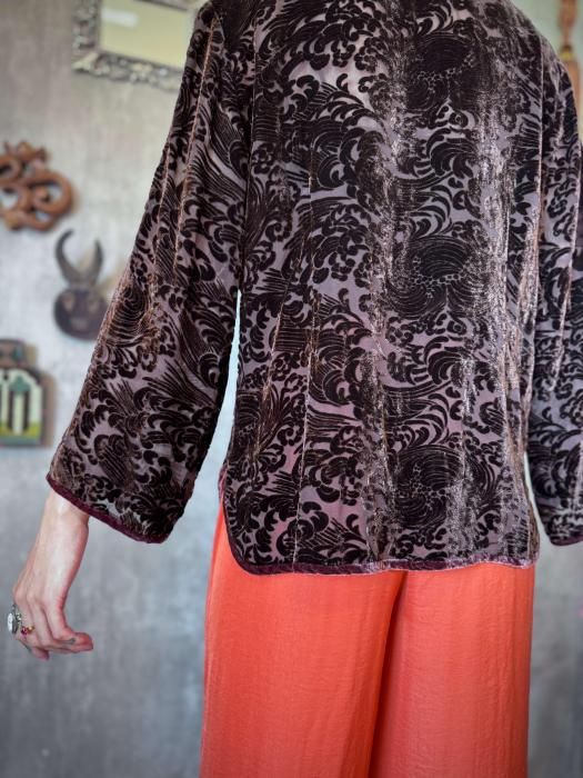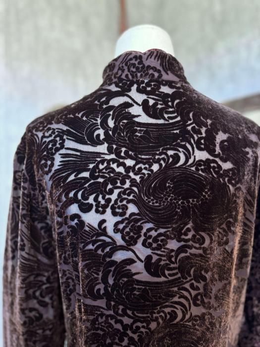 ほどよく透け感のあるシルク生地に、ベロアのフロッキープリントが施されたニュアンス感のある佇まいが印象的。秋冬のスタイルにマッチする深みのあるブラウンが季節感のあるコーディネートを叶えてくれます。