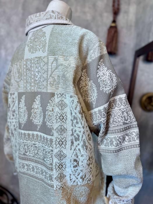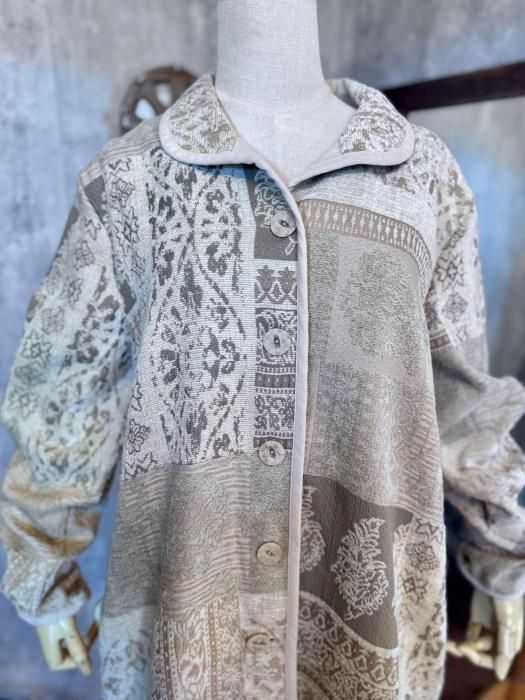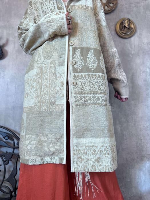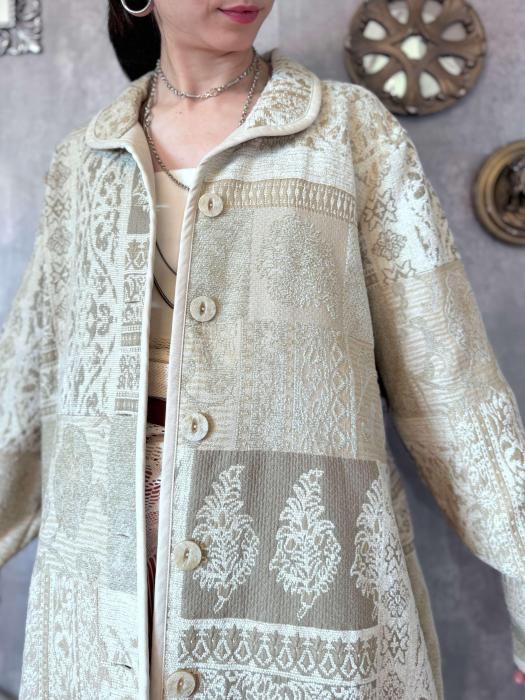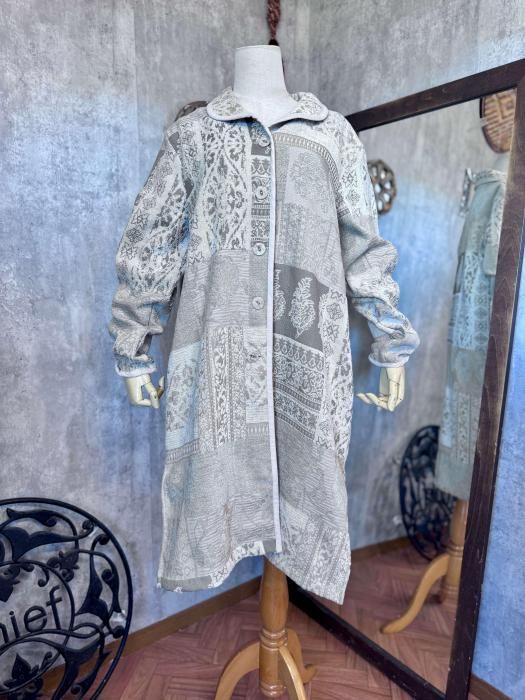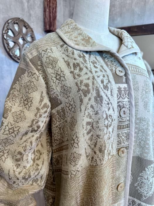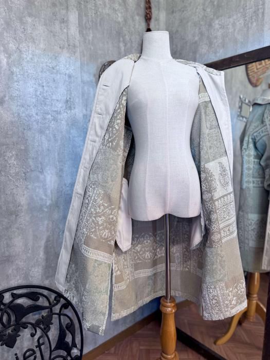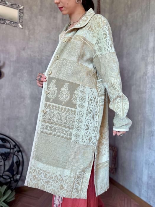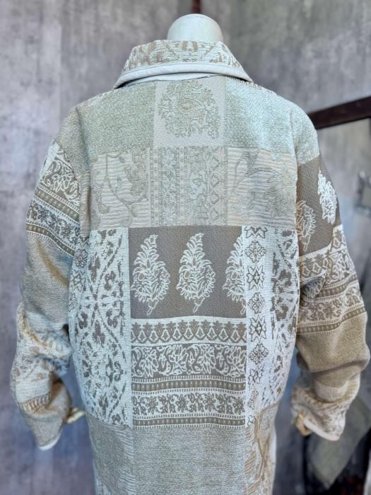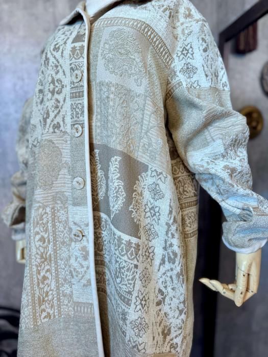 ランダムにミックスされた繊細なボヘミアンパターンと、ワントーンのカラーリングが優しげな印象を与えてくれるお品です。中厚手のタペストリー生地で仕立てられており、秋の主役アウターとして活躍するぬくもりのある着用感になっています。両サイドポケット付きです。