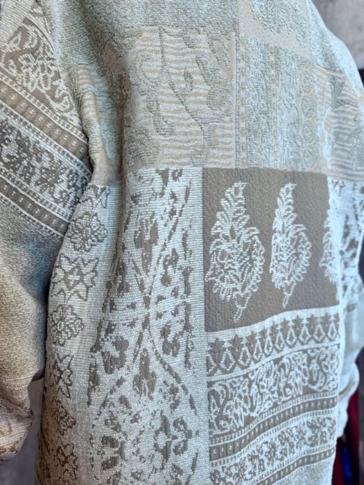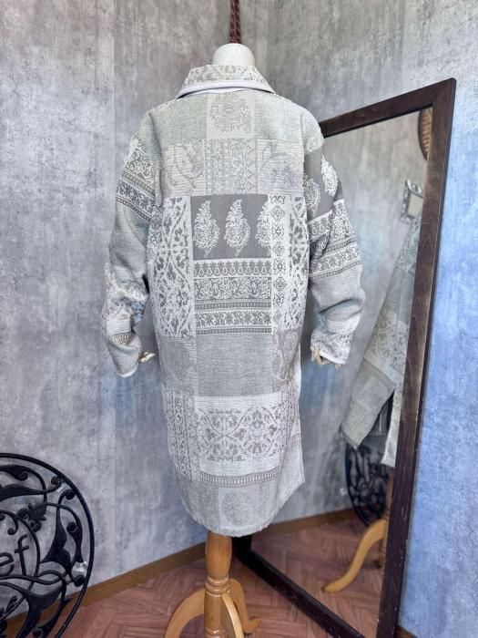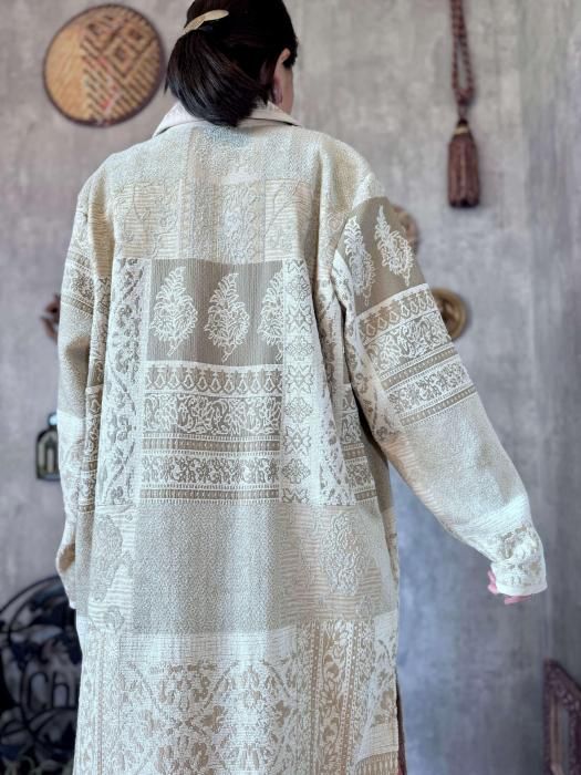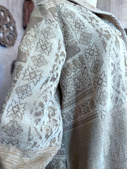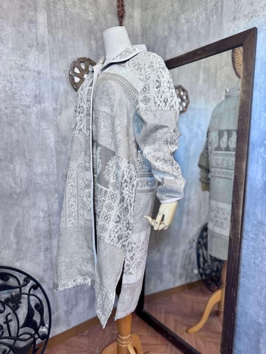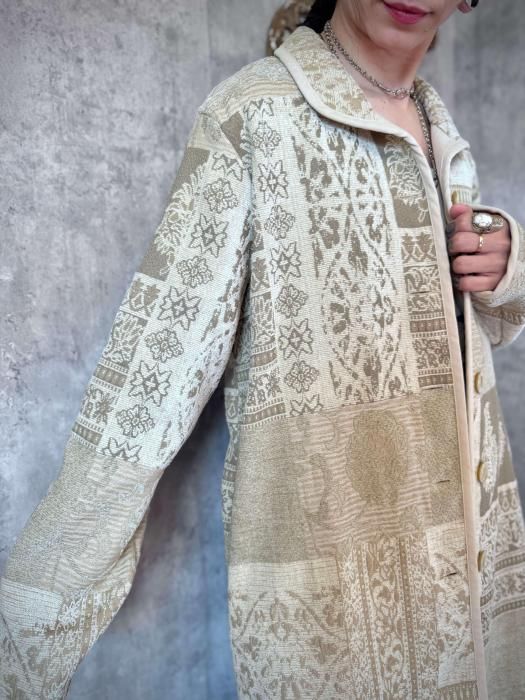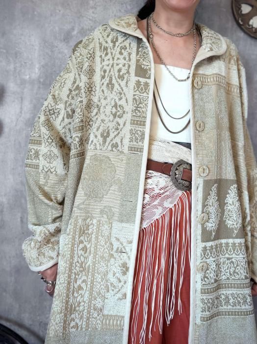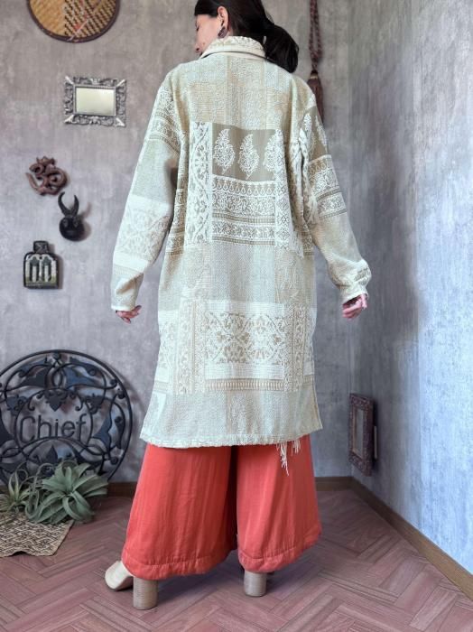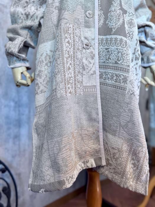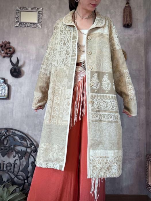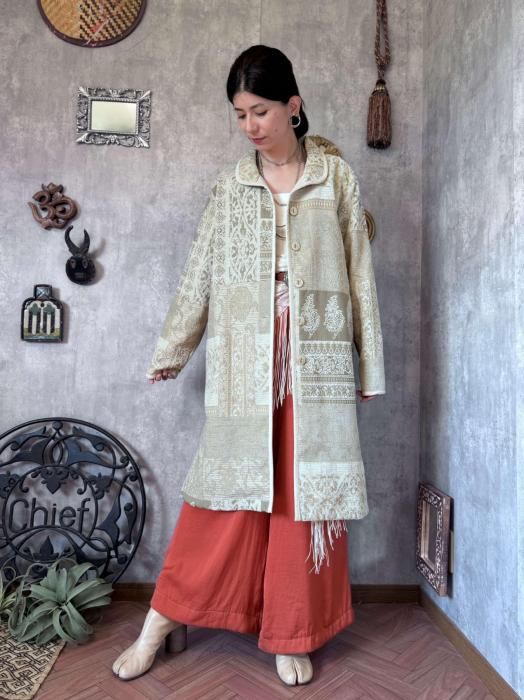 ランダムにミックスされた繊細なボヘミアンパターンと、ワントーンのカラーリングが優しげな印象を与えてくれるお品です。中厚手のタペストリー生地で仕立てられており、秋の主役アウターとして活躍するぬくもりのある着用感になっています。両サイドポケット付きです。