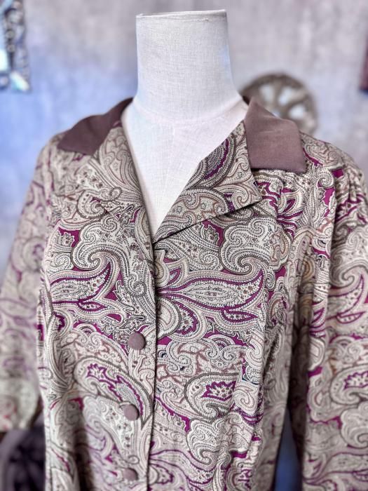 秋冬の着こなしによくマッチするシックなカラートーンのペイズリー柄が美しい1着です。ストンとした落ち感のあるストレートシルエットと開襟がエレガントな装いを叶えてくれます。背中のリボン紐でフィット感をお好みに調整していただけます。