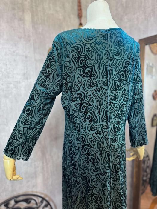 こっくりとしたモスグリーンのカラーが冬の着こなしにマッチするエレガントな1着です。ベロアによって描かれた繊細なアラベスクパターンは光の当たり具合によってつやめく様も大変美しいです。