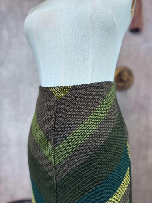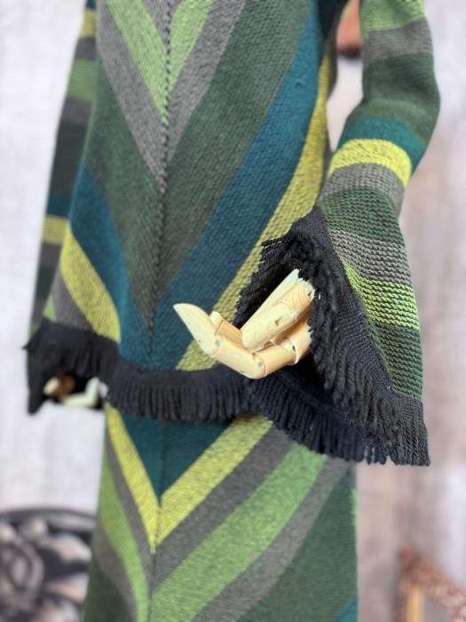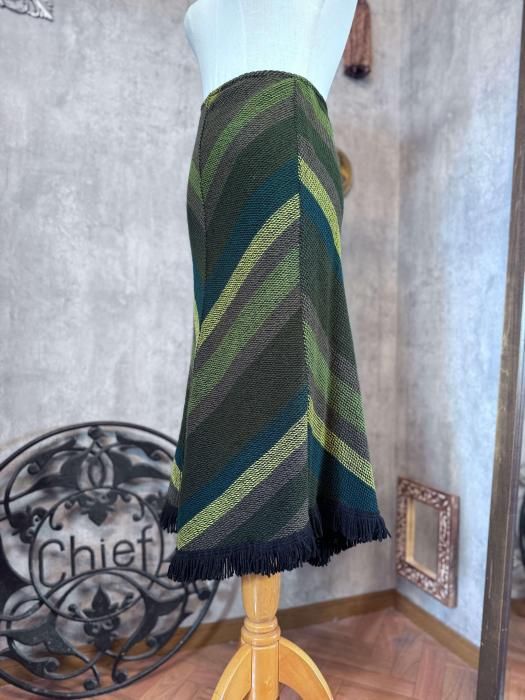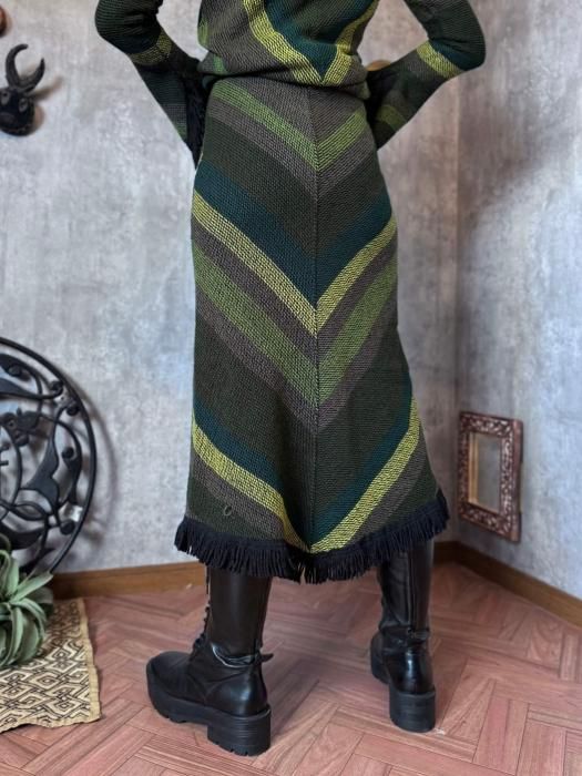 グリーンなどのアースカラーのグラデーションがユニークなニットのテキスタイルが印象的。裾に施されたボリューミーなフリンジがアクセントになってくれます。