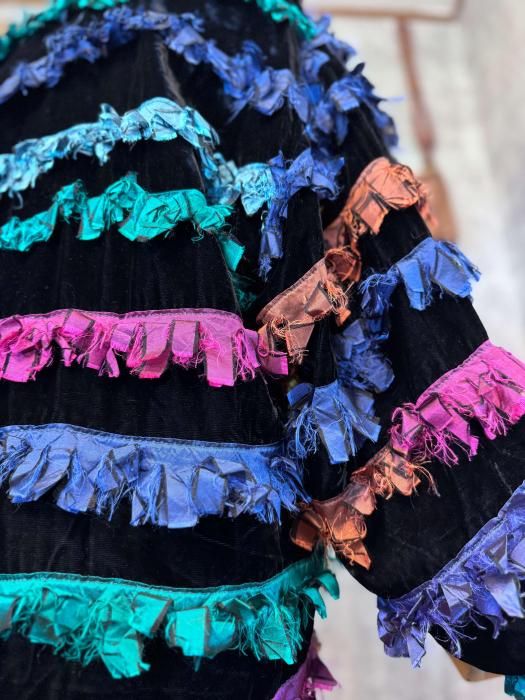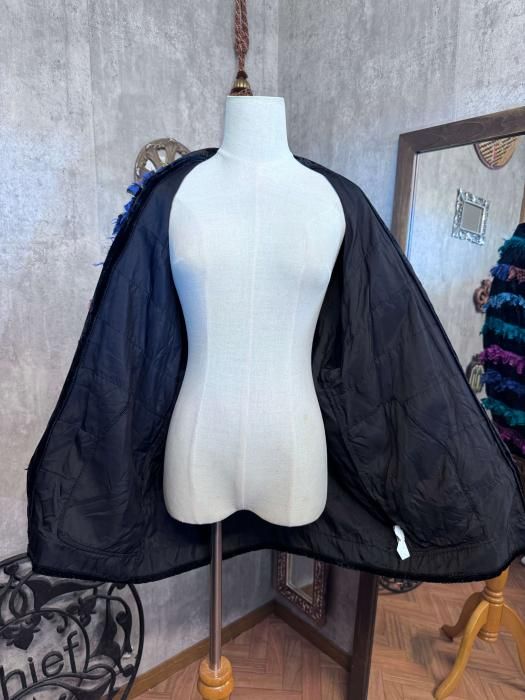 一目で目を惹くファニーな佇まいがヴィンテージならではの1着です。ベース生地は艶やかなブラックベロア、マルチカラーの切りっぱなしフリンジがたっぷりと施されています。フロントにはアクセサリーのようなボタンが2つ付いています。体をすっぽりと覆い込むようなオーバーサイズシルエットで、インナーに分厚いニットやスエットなどもレイヤードできるため、長い時期お楽しみいただけます。
