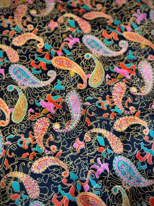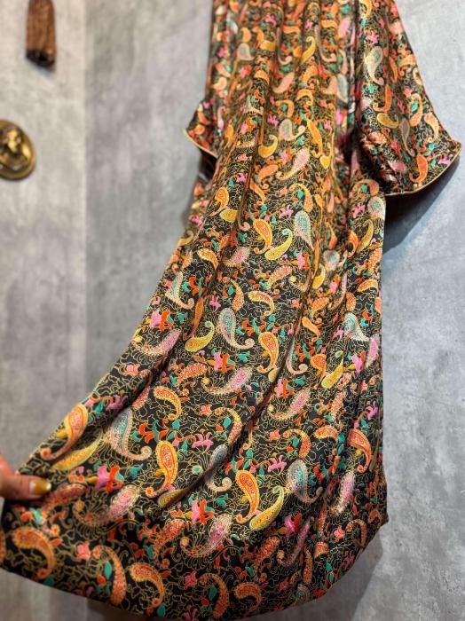 ブラックをベースに、細やかでカラフルなペイズリー柄が全面に広がる印象的なテキスタイルです。大胆なラグランスリーブとゆったりとしたフォルムが特徴で、身体を包み込むようなエアリーなシルエットに。動くたびに柔らかなドレープが生まれ、自然と華やかな佇まいを演出します。