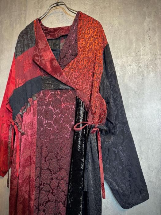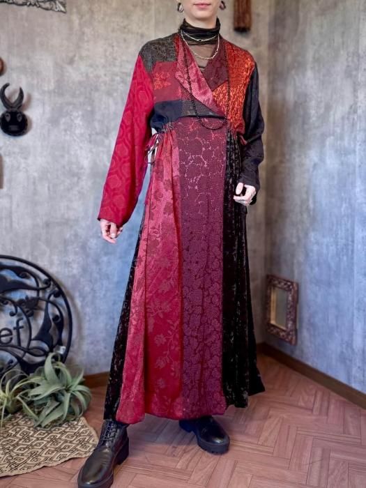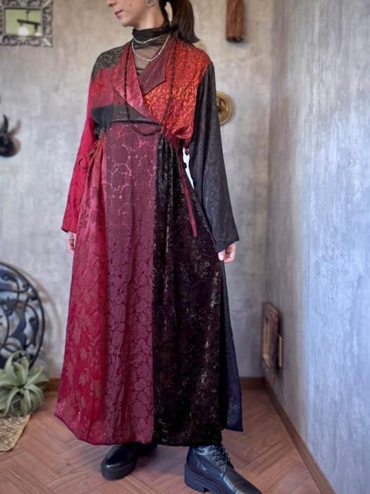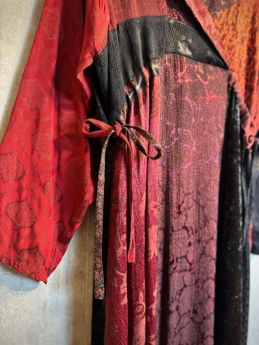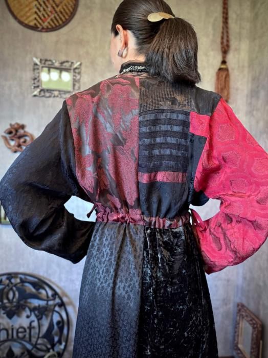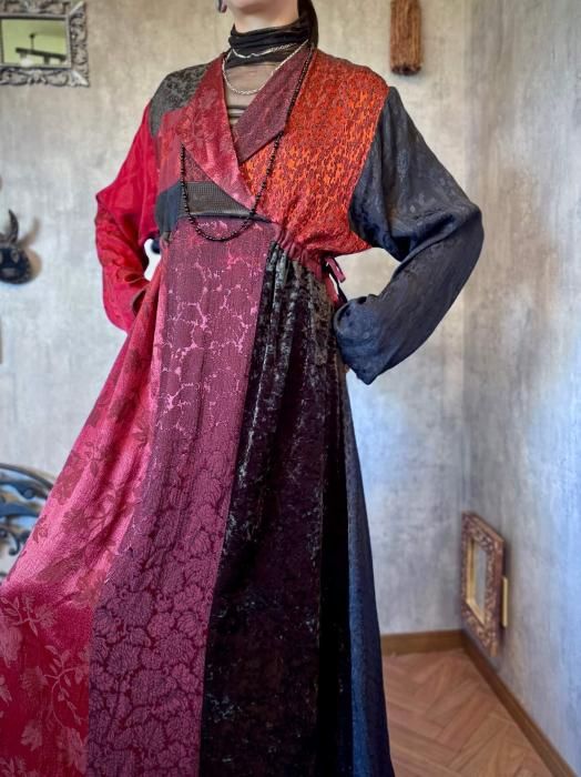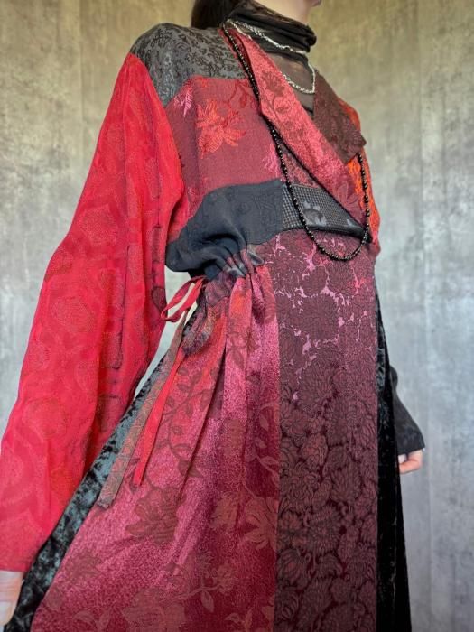 ダークトーンのレッドとブラックを基調に、花柄やアラベスク柄をバランスよく配した奥行きのあるテキスタイルが印象的です。ウエスト両サイドのリボンで身幅とシルエットの調整が可能。胸元はカシュクール仕様で、女性らしいラインを引き立ててくれます。