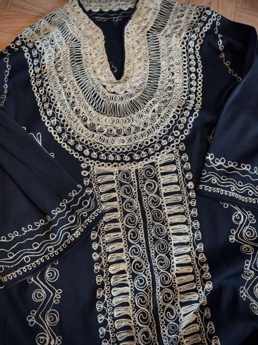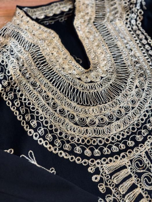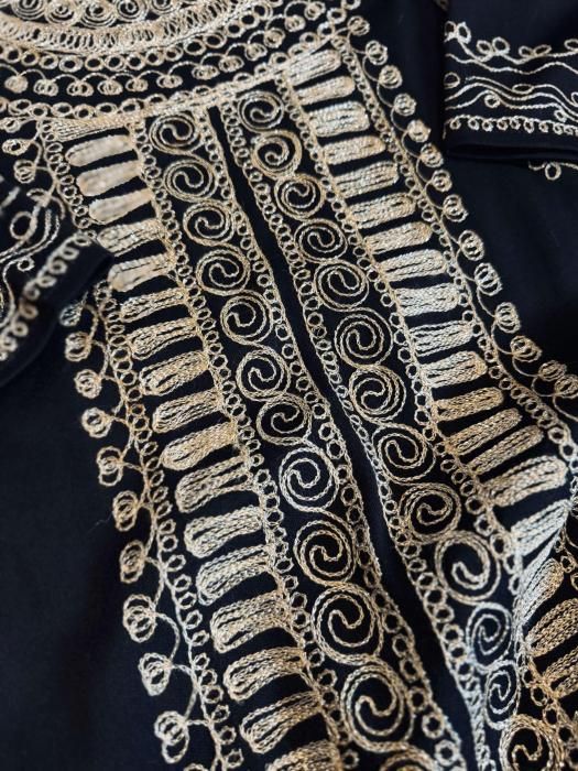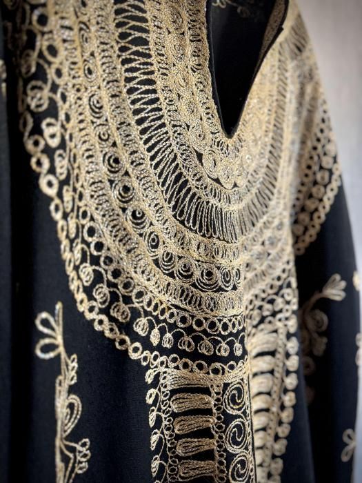 ブラックをベースにラメ入りのゴールド刺繍が全体に贅沢に施された華やかな一着です。オリエンタル調の繊細な模様が美しく、クラシカルでエキゾチックな雰囲気を感じさせます。