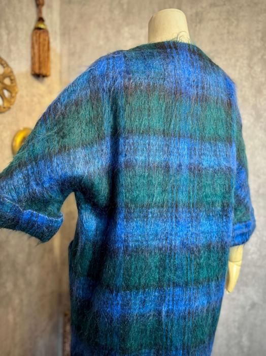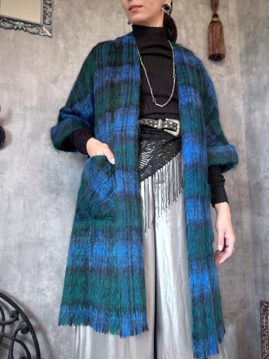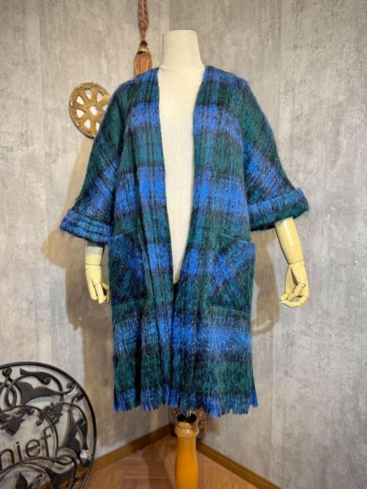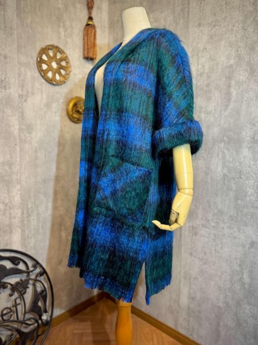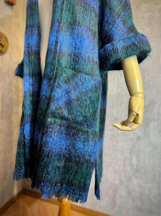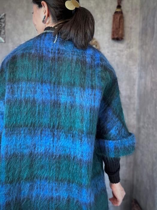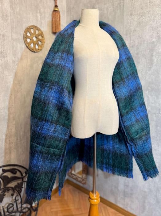 モヘヤならではの長い毛足が生む、ふわふわとした柔らかな質感が魅力です。ブルーとグリーンが重なり合うチェック柄は、深みがありながらも優しく、冬の装いに程よい彩りを添えてくれます。